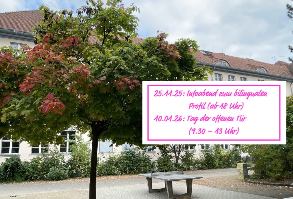 Liebe Schüler*innen, liebe Eltern der 6. Klassen, mit Blick auf das Schuljahr 2026/27 laden wir Euch und Sie zu zwei Informationsveranstaltungen ein. Eine Anmeldung ist jeweils nicht notwendig. Am Dienstag, 25. November 2025, stellen wir ab 18.00 Uhr unser bilinguales Profil vor. Außerdem steht der Ablaufplan zum Tag der offenen Tür am Samstag, 10. Januar 2026, fest.