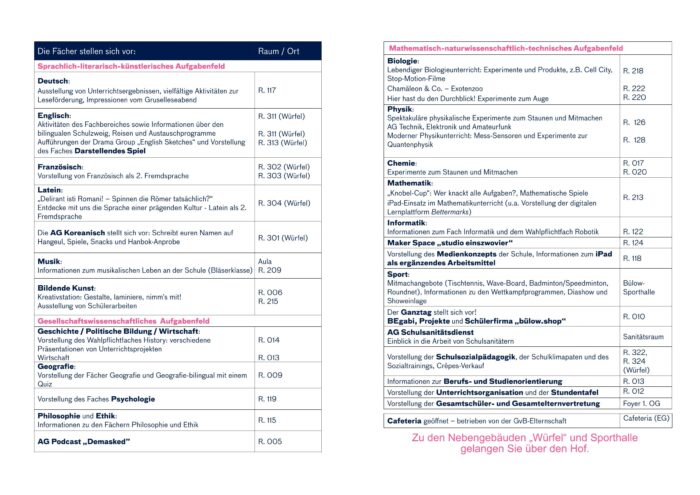 ca. 11.45 Uhr: Schüler*innen führen zukünftige Siebtklässler durch die Schule; Ende ca. 12.30 Uhr auf dem Hof (Überdachung)
