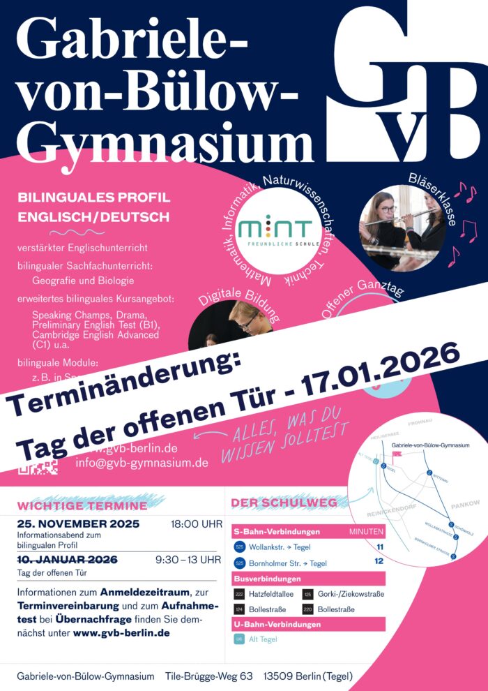 Alle interessierten Schüler*innen und ihren Eltern erhalten an diesem Tag einen ebenso informativen wie unterhaltsamen Einblick in das Schulleben am Gabriele-von-Bülow-Gymnasium. Wir freuen uns auf neugierige Fragen!