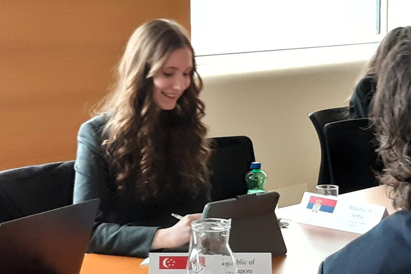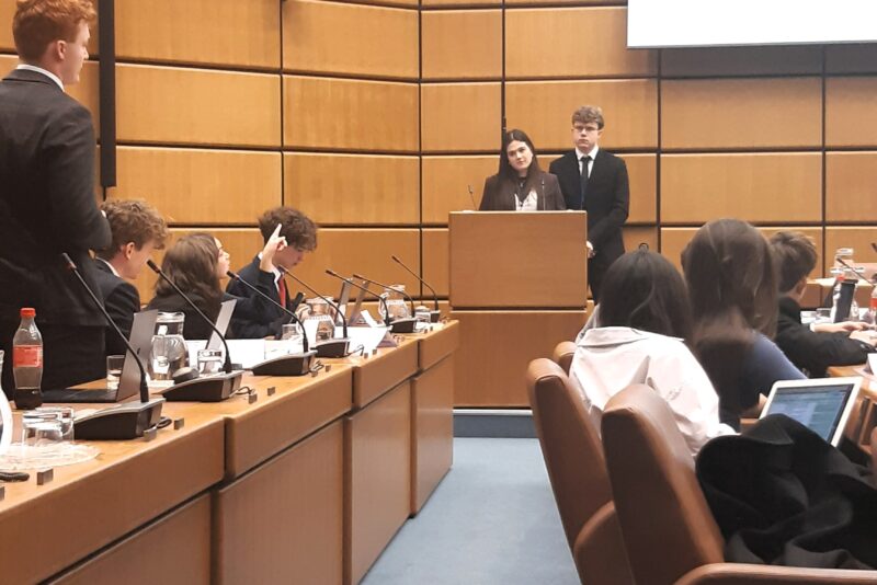 - UNHSC – der Historische Sicherheitsrat, in dem frühere Krisen nachvollzogen werden. Hier ging es um den Vietnamkrieg und um den Genozid an bosniakischen Muslimen in Srebrenica von 1995. Unsere Delegierten repräsentierten Kanada, das sich gegen den Vorwurf der Unterstützung des amerikanischen Vorgehens in Vietnam verteidigen musste, und Albanien, einst nahe dran am Genozid in Bosnien.