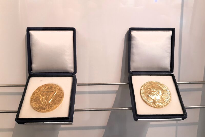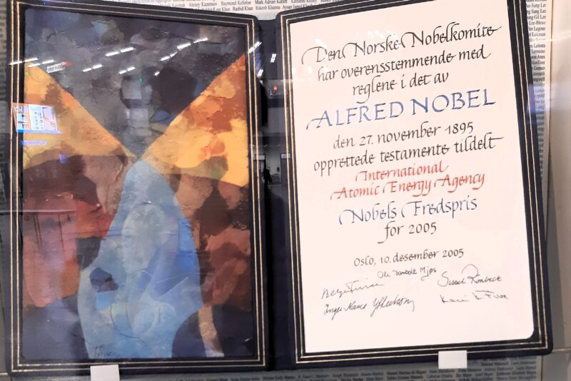 - „Frieden“ bei den Vereinten Nationen: Verleihung des Friedensnobelpreises an die UN im Jahr 2005; die Bronzeskulptur The Link der türkischen Künstlerin Mina Sunar, der schon einmal die Taube entwendet wurde.