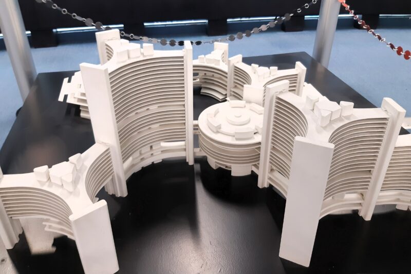 - Modell des Amtssitzes Internationaler Organisationen und Konferenzzentrum Wien des Architekten Johann Staber (1974) – Board Room D, zweitgrößter Sitzungssaal im UN-Komplex, in dem ein MUN-Ausschuss tagen durfte – Aktionskunst des zeitgenössischen österreichischen Malers Hermann Nitsch