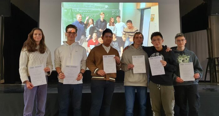Sieben Schülerinnen und Schüler aus den Leistungskursen Physik hatten im Herbst 2022 die Gelegenheit, an der Talentschule „Mathematische Anatomie der Quantenmechanik“ teilzunehmen. Die Veranstaltung fand auf Universitätsniveau und in englischer Sprache statt. Am 11. Januar 2023 erhielten die Teilnehmenden ihre Urkunden als Anerkennung für ihre erfolgreiche Teilnahme an der Talentschule.