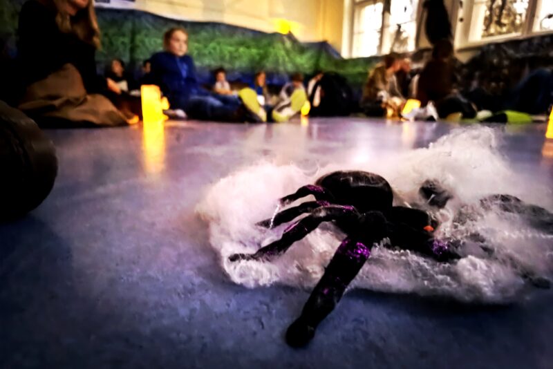 Der Höhepunkt folgte am Ende dieses gemeinsamen Herbstabends: ein gemeinsamer Spaziergang durch das finstere Schulgebäude inklusive Keller, wo in Nischen und hinter Flurbiegungen gruselig kostümierte und geschminkte Erschrecker*innen auf die Kinder warteten. *kreisch*