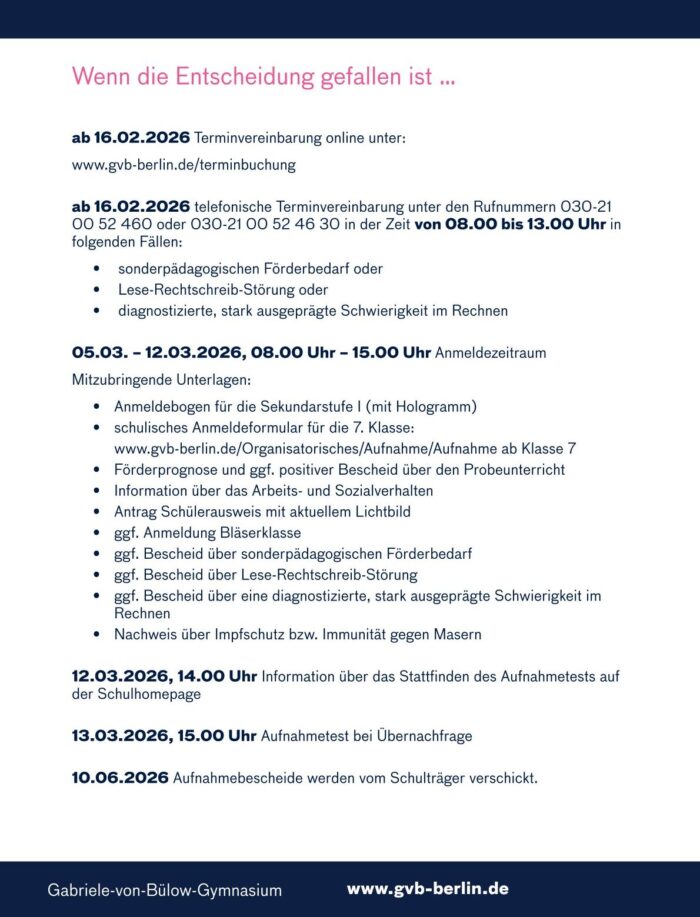 Wenn Ihr Kind eine Gymnasialempfehlung hat und Sie sich für das Gabriele-von-Bülow-Gymnasium entschieden haben, vereinbaren Sie bitte einen Termin zur Anmeldung Ihres Kindes. Dies ist ausschließlich online möglich ab 16. Februar 2026 ab 9.00 Uhr unter www.gvb-berlin.de/terminbuchung.