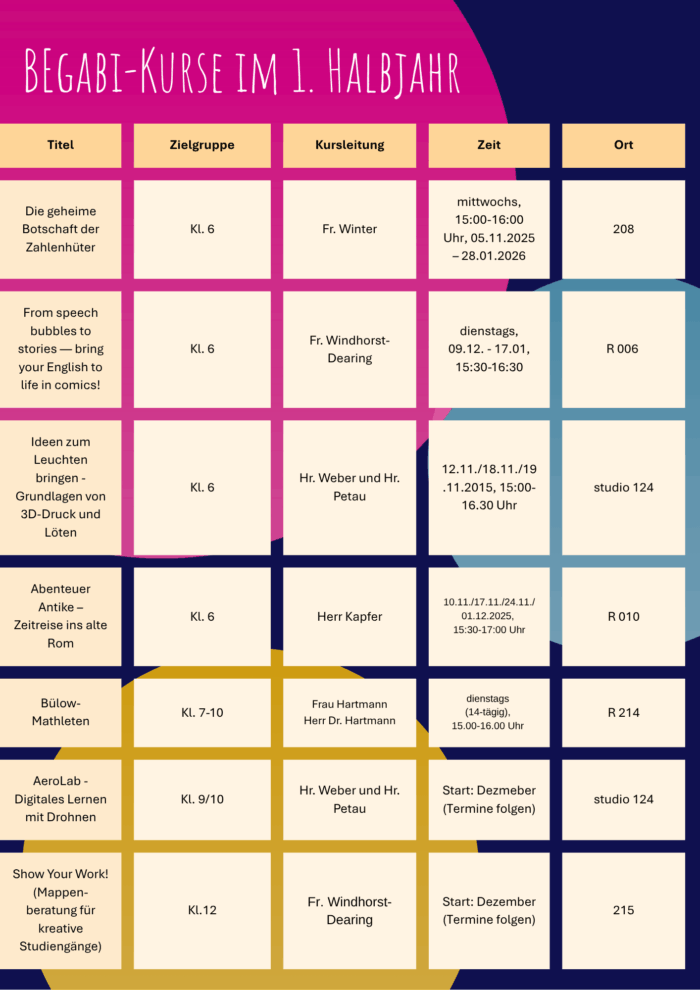 Du hast Spaß am Lernen, bist neugierig und möchtest dich über den normalen Unterricht hinaus weiterentwickeln? Dann könnten die BEgabi-Kurse genau das Richtige für dich sein! Hier kannst du deine Talente in spannenden Bereichen wie Naturwissenschaften, Sprachen, Kunst, Musik, Sport oder digitalen Themen vertiefen.